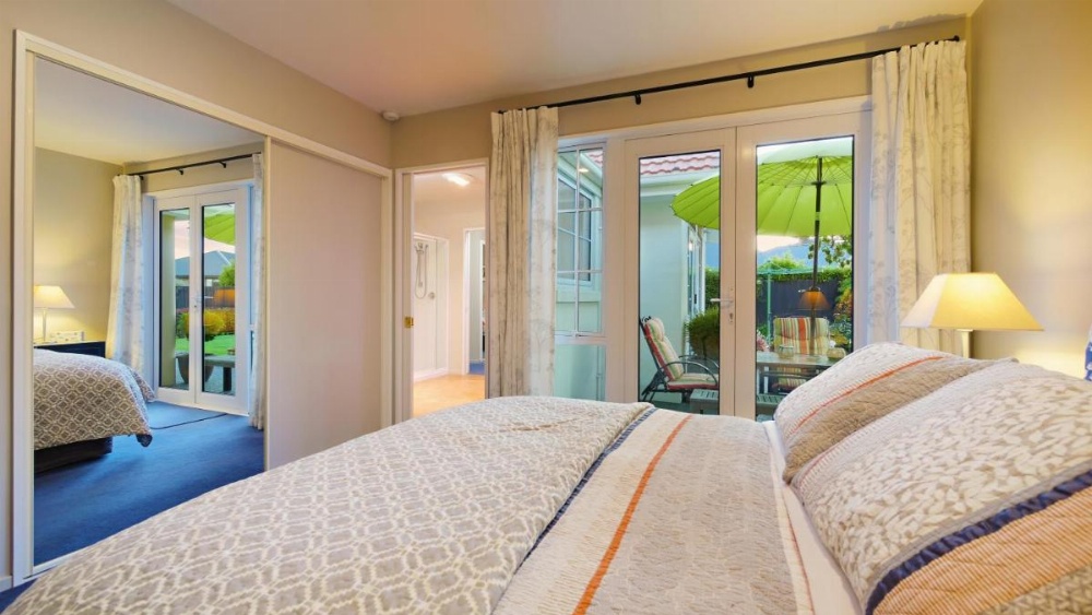 This heated guest room opens onto a patio with views of the garden. The private bathroom features a corner spa bath and separate shower.
